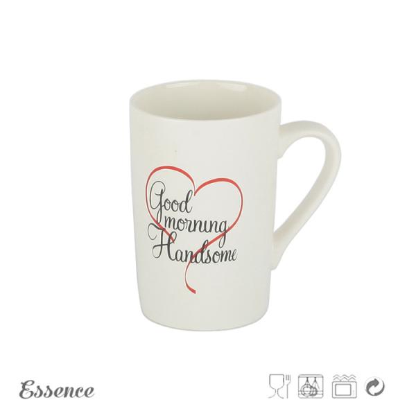 The white ceramic coffee mugs are made from new bone china material. It is fired in the high temperature kiln so it is durable and glossy enough. The pattern of mug is decal printing. It is nice design for your businesses.